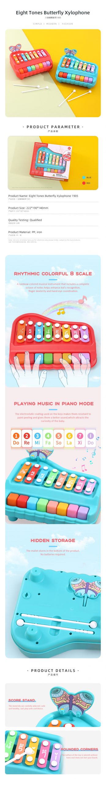 Features:1.A rainbow-colored musical instrument that includes a complete octave of notes helps enhance kid’s recognition, finger dexterity and hand-eye coordination.2.The electrostatic coating used on the keys makes them resistant to paint peeling and gives them a better sound.3.The mallet stores in the bottom of the product. No batteries required.