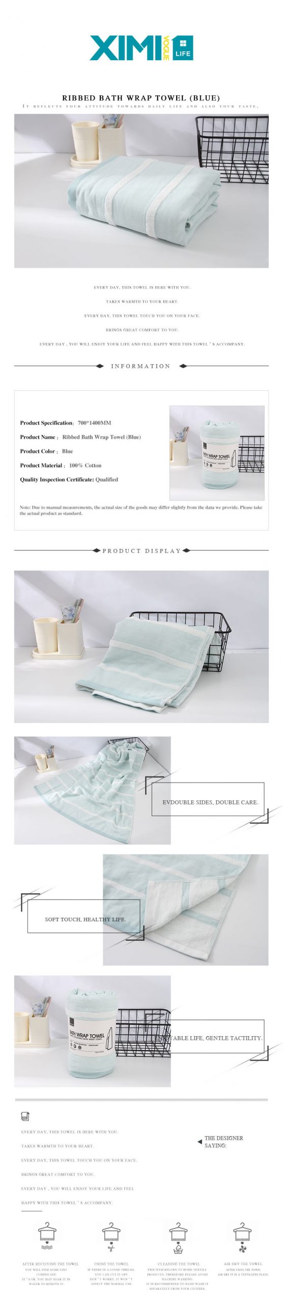 Usage:1.There may be a small amount of lint coming off during manufacture process. Please gently hand wash with warm water before first use. 2.Do not bleach. Do not machine wash. Do not dry clean. Machine washing will damage the cotton yarn and terry. It is recommended to hand wash. 3.Washing water temperature: under 40℃(104℉).