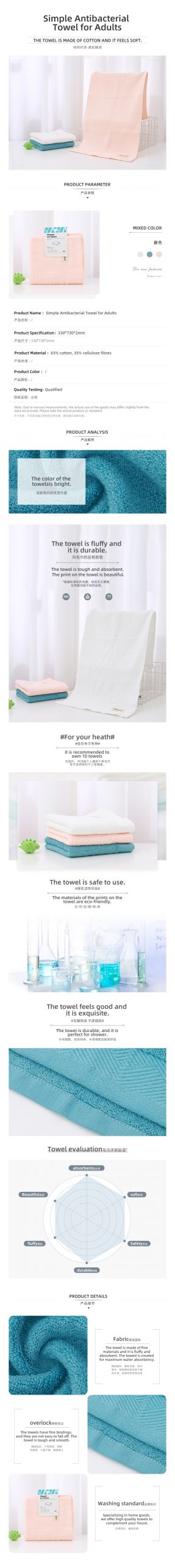 Notes:1.It is a normal phenomenon that there is lint coming off or discoloration during first wash. Please wash before first use. 2.Towels are personal hygienic products where bacteria will grow after long-term use. It is recommended by experts to replace them every three months for adults and every one month for children.